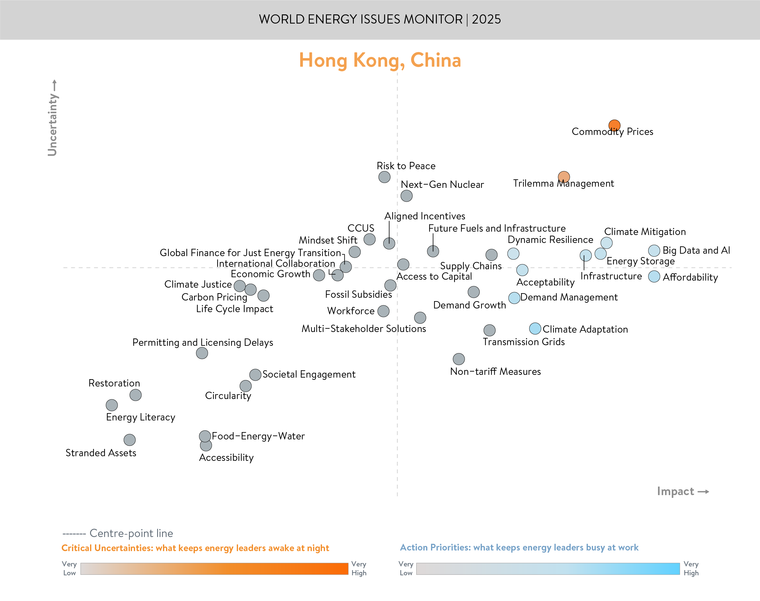 Since the last iteration of the World Energy Issues Monitor, plans to diversify energy sources have continued by increasing the use of natural gas to displace coal for electricity generation, commencing operation of the first offshore LNG terminal and importing more zero-carbon energy from Mainland China through regional cooperation. Despite these steps forward, uncertainty remains. This sentiment is largely due to prices of LNG being subject to global market dynamics, geopolitical tensions, and supply chain disruptions. Over a longer time horizon, the development of green hydrogen to decarbonise hard-to-abate sectors, including blending hydrogen into natural gas for power generation, is in progress. The success of these initiatives depends on the eventual availability and affordability of green hydrogen and its derivatives. Commodity prices therefore remain a critical uncertainty in the 2025 Hong Kong Energy Issues Map.