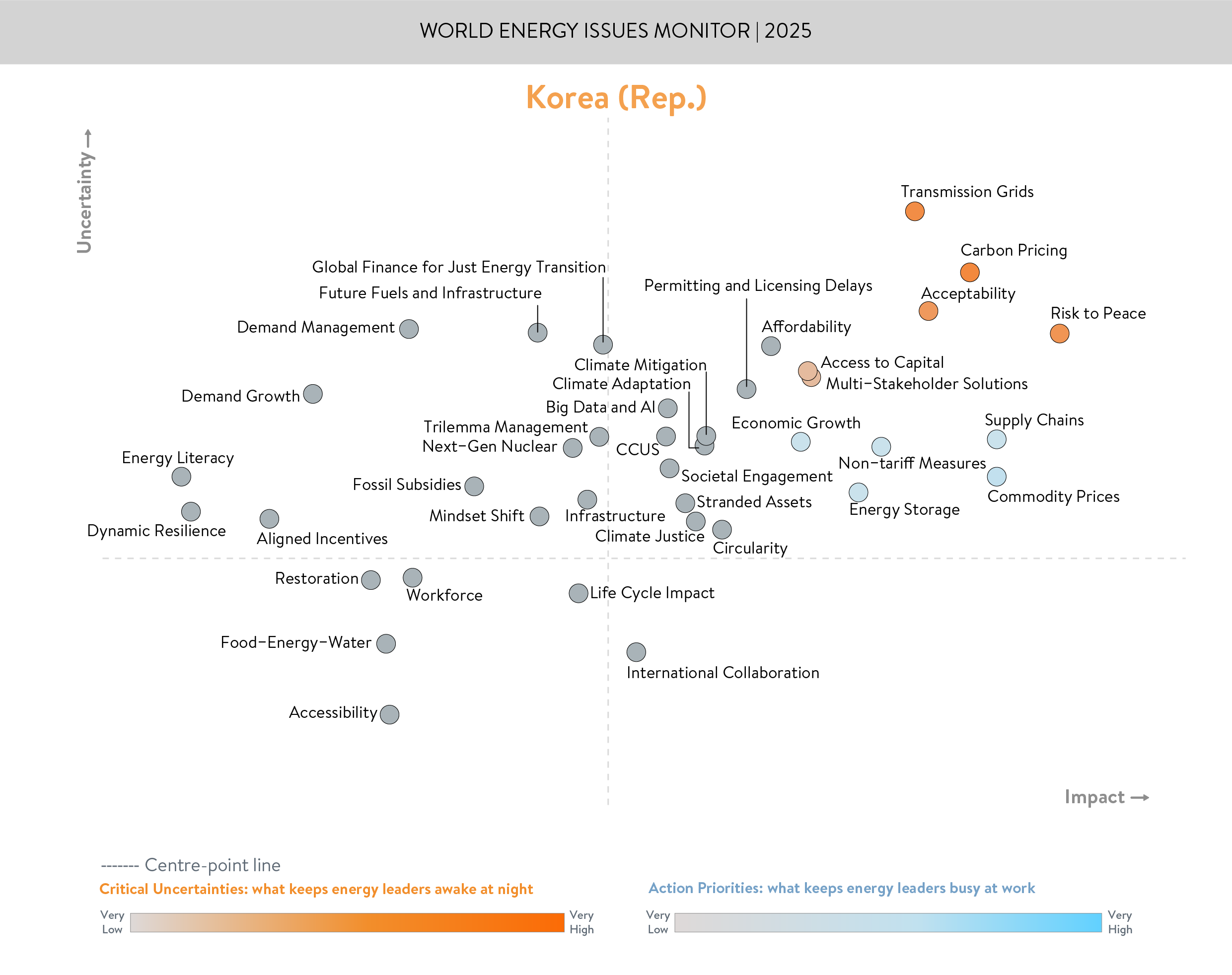 South Korea’s previous Energy Issues Monitor report was published in 2022. Since then, several energy issues included in the survey have undergone improvements, been revised, or newly added. While these adjustments reduce the number of issues that can be directly compared, it is worth noting that while many issues were classified as Critical Uncertainties in the previous assessment, this year’s results show that most of these have been reclassified as Watch Issues, with a reduced level of uncertainty attributed to them.